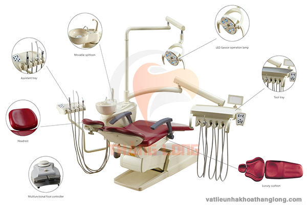 Ghế nha khoa model KJ-917 (2018) được tích hợp sẵn máy cạo vôi răng siêu âm và đèn trám quang trùng hợp LED sẵn trong máy.